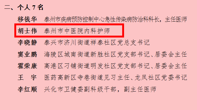 3月12日,泰州市效能建設領導小組給予我院16名一線抗疫人員新冠肺炎疫情防控工作“駿馬獎”,其中泰州市第二批援湖北醫(yī)療隊獲集體獎,15位隊員來自泰州市中醫(yī)院,我院內(nèi)科護師胡士偉獲個人獎。