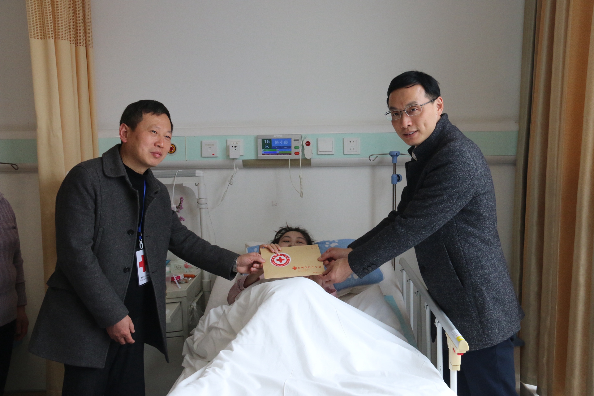 2019年3月22日上午,泰州市紅十字會黨組成員、副會長梅友宏,我院黨委副書記孫曉軍帶著泰州市中醫(yī)院醫(yī)護人員的關愛深入病區(qū)探望小霞和老王,并將醫(yī)院干部職工捐贈的近萬余元現(xiàn)金,送到小霞手中。