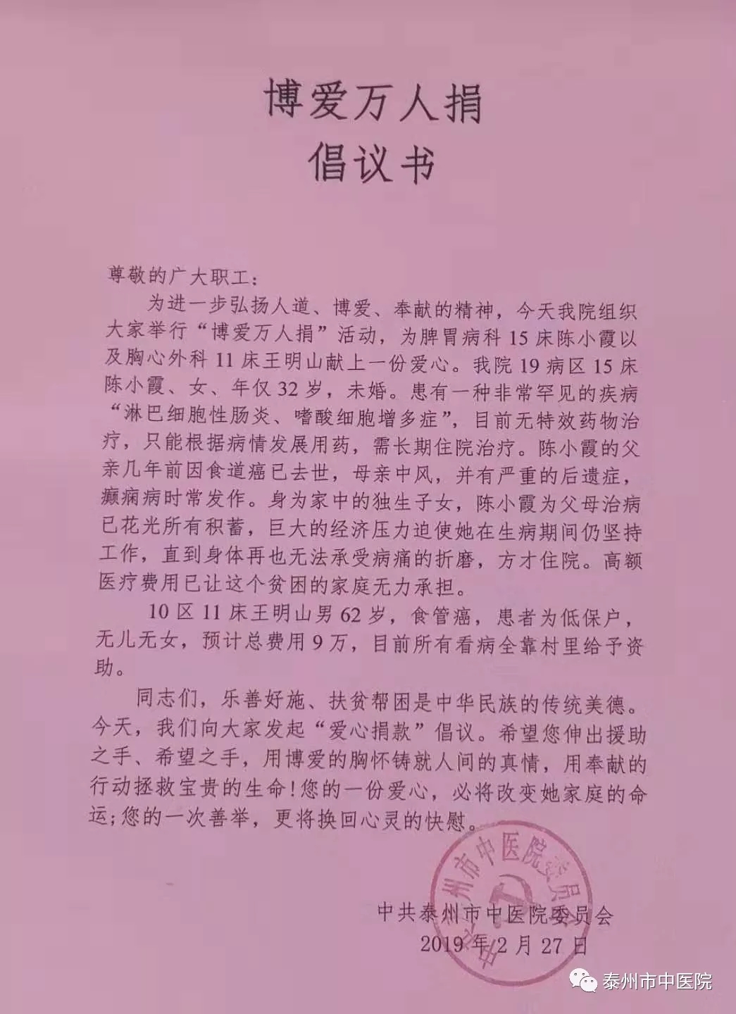 泰州市中醫(yī)院黨委辦公室發(fā)起了“紅十字博愛萬人捐”的倡議活動,全院干部職工積極響應,紛紛伸出了援助之手。