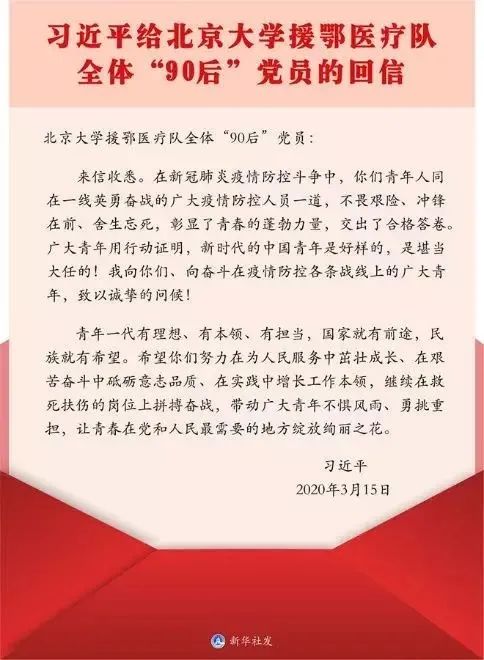 2020年3月15日,中共中央總書記、國家主席、中央軍委主席習(xí)近平給北京大學(xué)援鄂醫(yī)療隊全體“90后”黨員回信,向他們和奮斗在疫情防控各條戰(zhàn)線上的廣大青年致以誠摯問候,表達了對奮斗在疫情防控一線的廣大青年醫(yī)護人員的關(guān)心肯定,同時也鼓勵更多的新時代新青年們不畏艱難、勇挑重擔(dān),讓青春在黨和人民最需要的地方綻放絢麗之花。