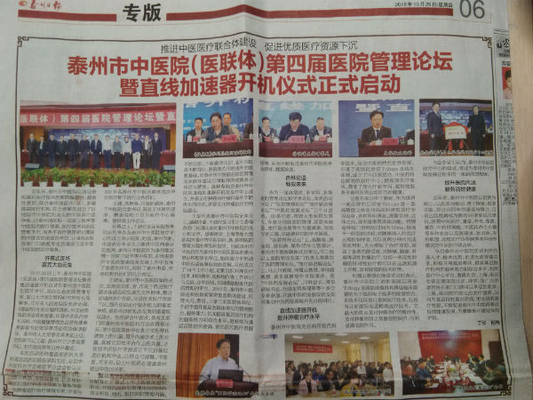 2018.10.25泰州日報:泰州市中醫(yī)院(醫(yī)聯(lián)體)第四屆醫(yī)院管理論壇暨直線加速器開機儀式正式啟動