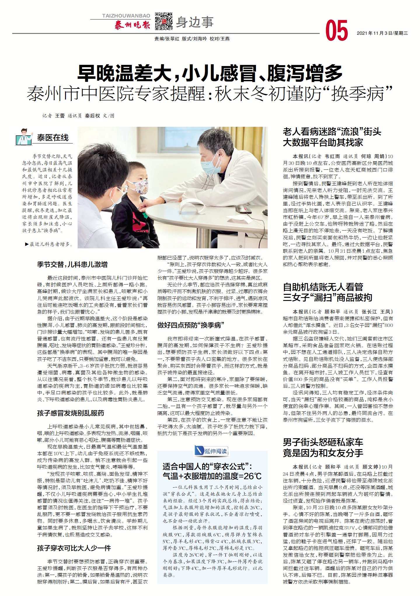 【泰州晚報11月3日】早晚溫差大,小兒感冒、腹瀉多