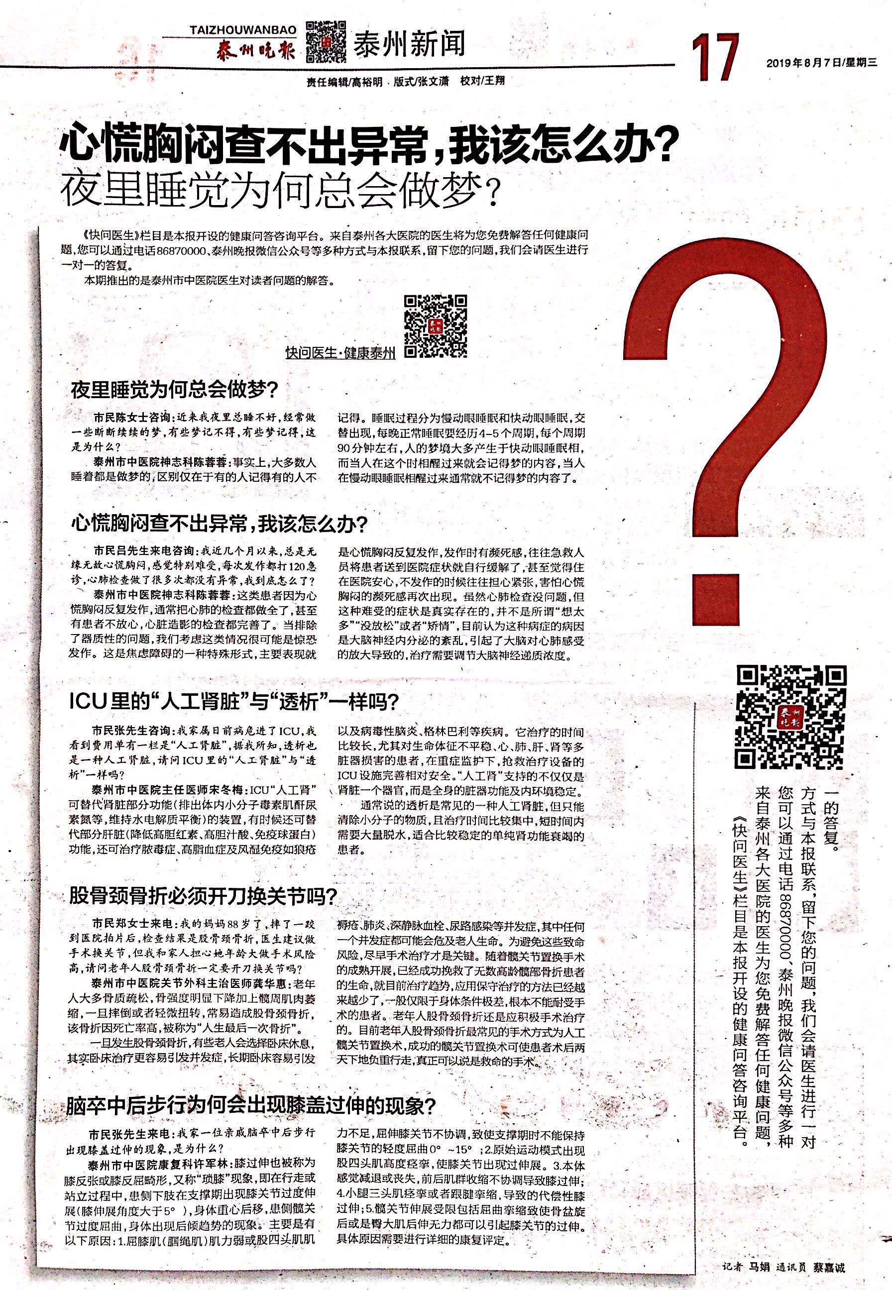 泰州晚報 8.7 心慌胸悶查不出異常,我該怎么辦?夜里睡覺為何總會做夢?