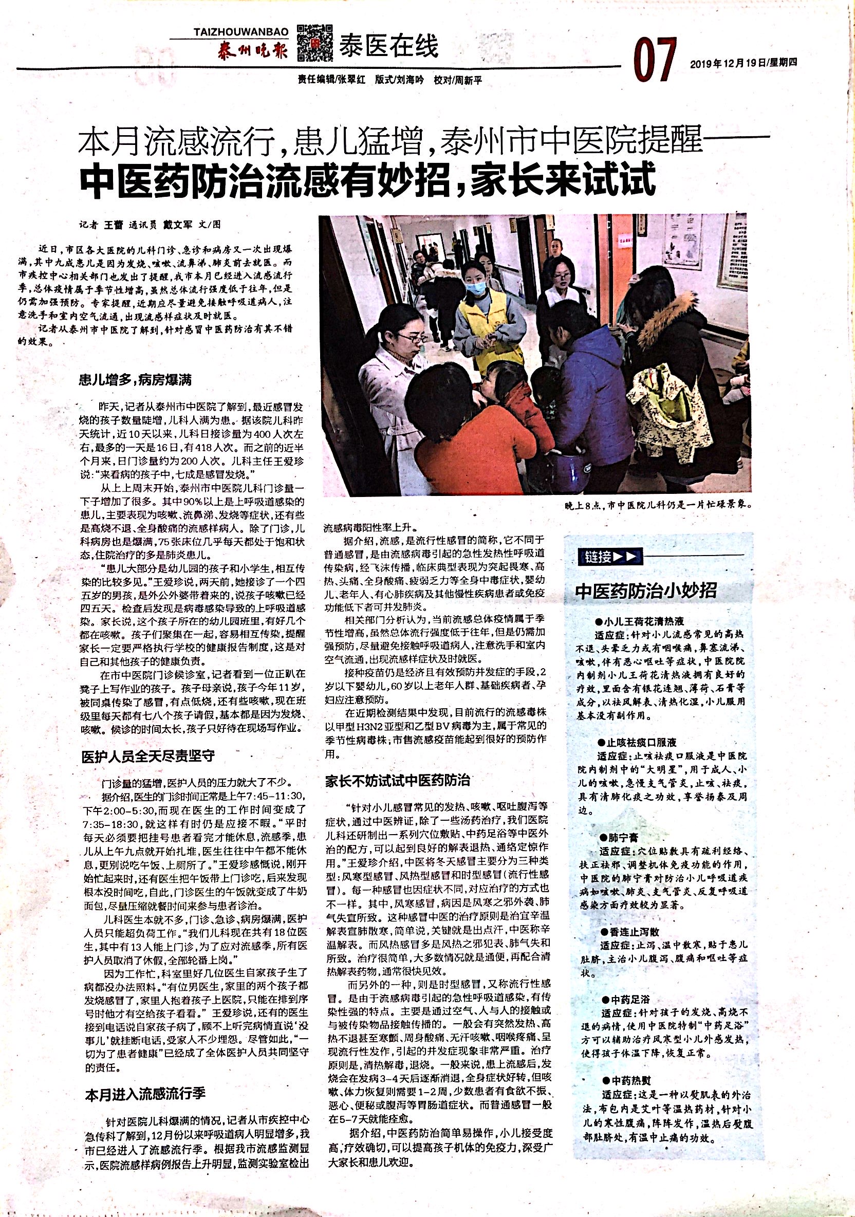 泰州晚報(bào) 12.19 本月流感流行,患兒猛增,泰州市中醫(yī)院提醒——中醫(yī)藥防治流感有妙招,家長(zhǎng)來試試