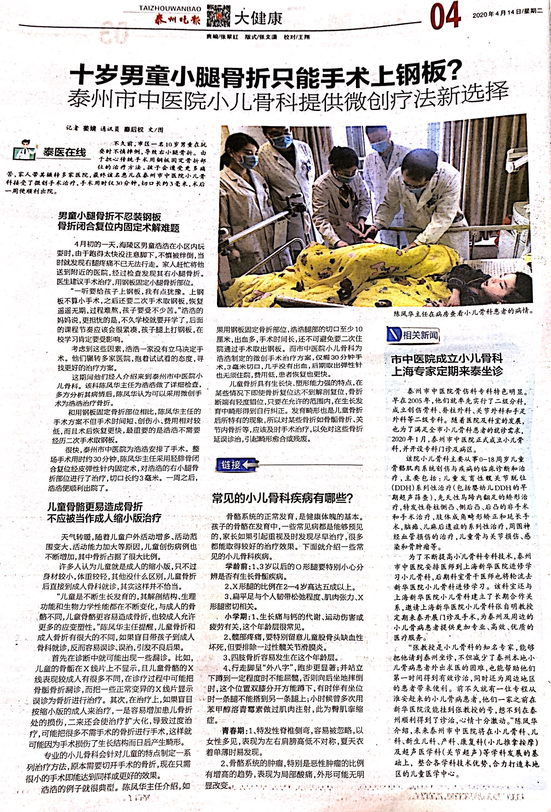 【泰州晚報(bào)4月14日】十歲男童小腿骨折只能手術(shù)上鋼板? 泰州市中醫(yī)院小兒骨科提供微創(chuàng)療法新選擇
