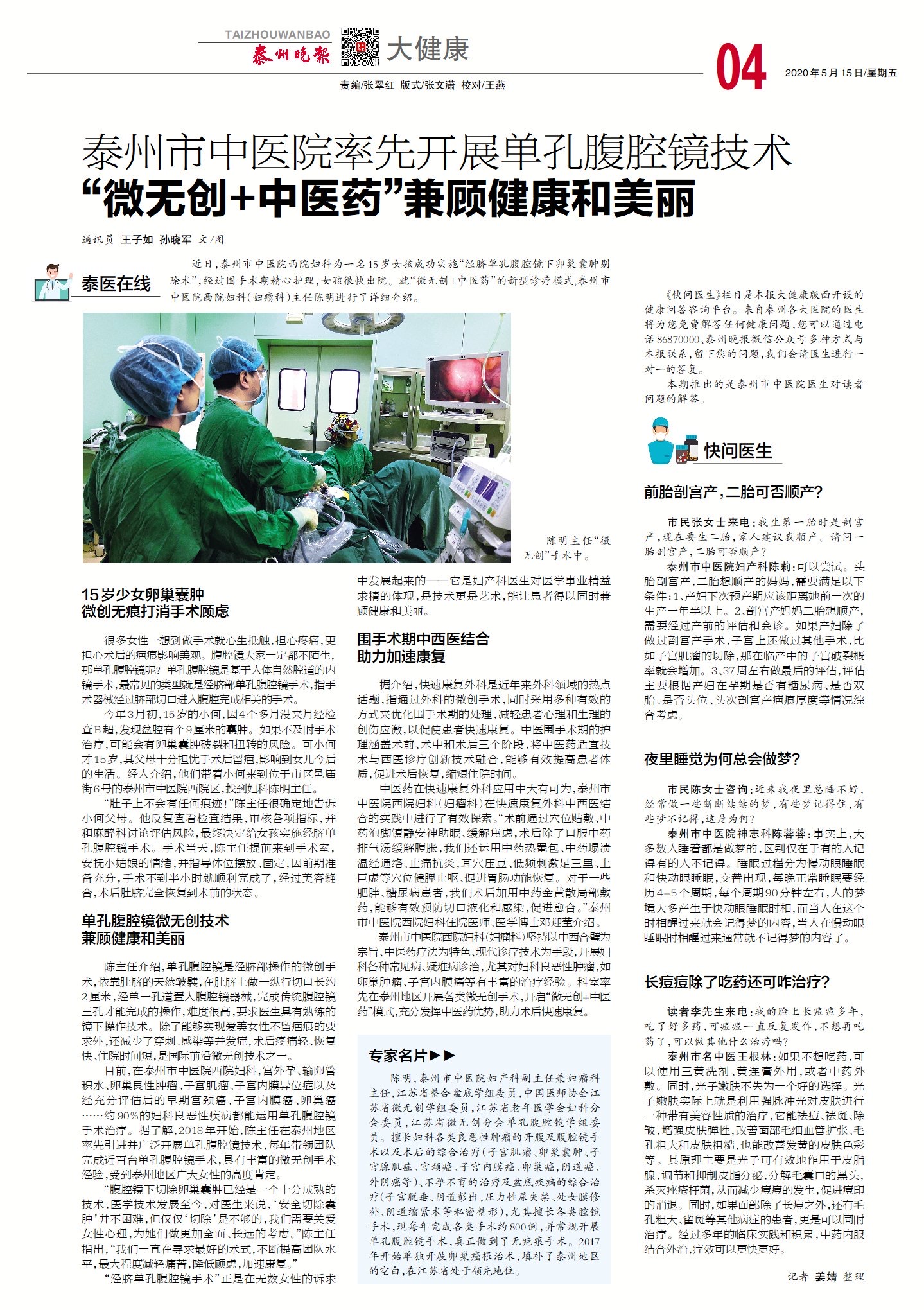 【泰州晚報(bào)5月15日】泰州市中醫(yī)院率先開(kāi)展單孔腹腔鏡技術(shù) “微無(wú)創(chuàng)+中醫(yī)藥”兼顧健康和美麗
