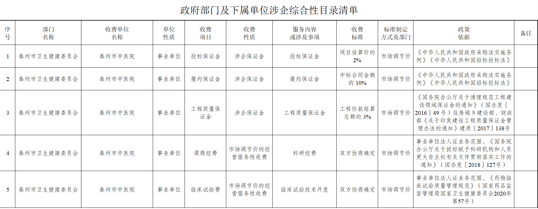 泰州市中醫(yī)院涉企綜合性目錄清單