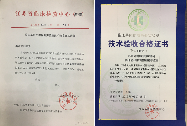 專家組成員討論后,一致同意我院臨床基因擴增實驗室技術驗收合格,江蘇省臨床檢驗中心蘇臨檢(2018)字第75號文件發(fā)布泰州市中醫(yī)院檢驗科臨床基因擴增檢驗實驗室技術驗收合格通知,并頒發(fā)《臨床基因擴增檢驗實驗室技術驗收合格證書》(No.00255)。